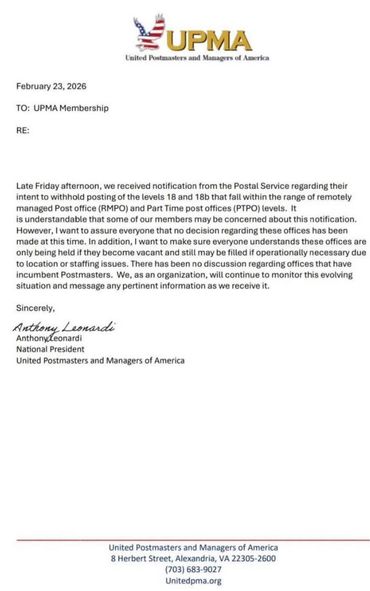UPMA is the collective voice of postmasters and managers across the nation. Our mission is to support, advocate, and empower our members through strong representation, professional development, and shared experience. Thank you for being part of a community that values leadership, service, and commitment.